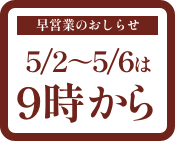 5/2(土)~5/6(水)は朝9時より繰り上げオープンいたします!!