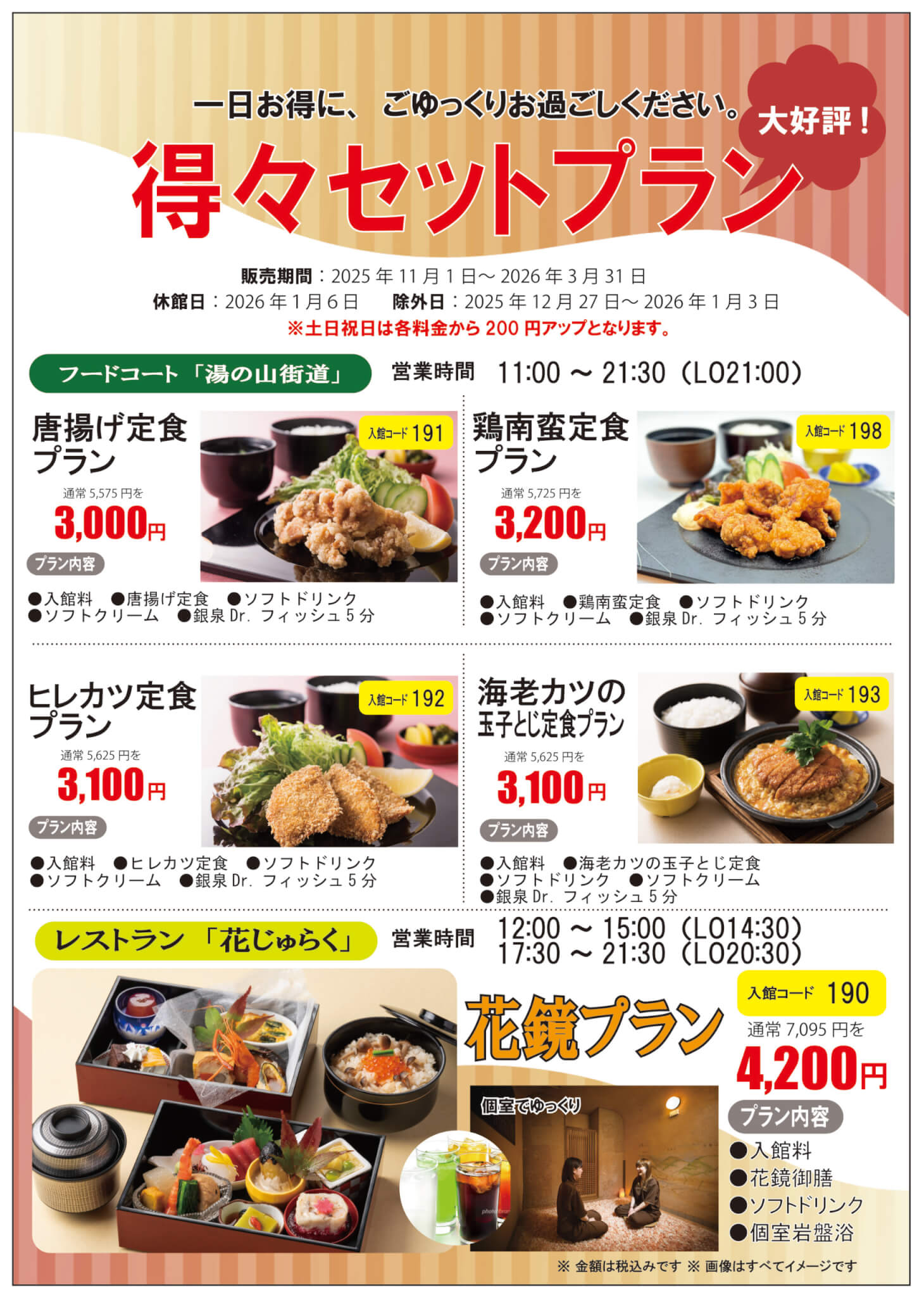 レストラン「花じゅらく」でも大人気の花鏡御膳と個室岩盤浴がセットになりましたお得なプランがございます♪